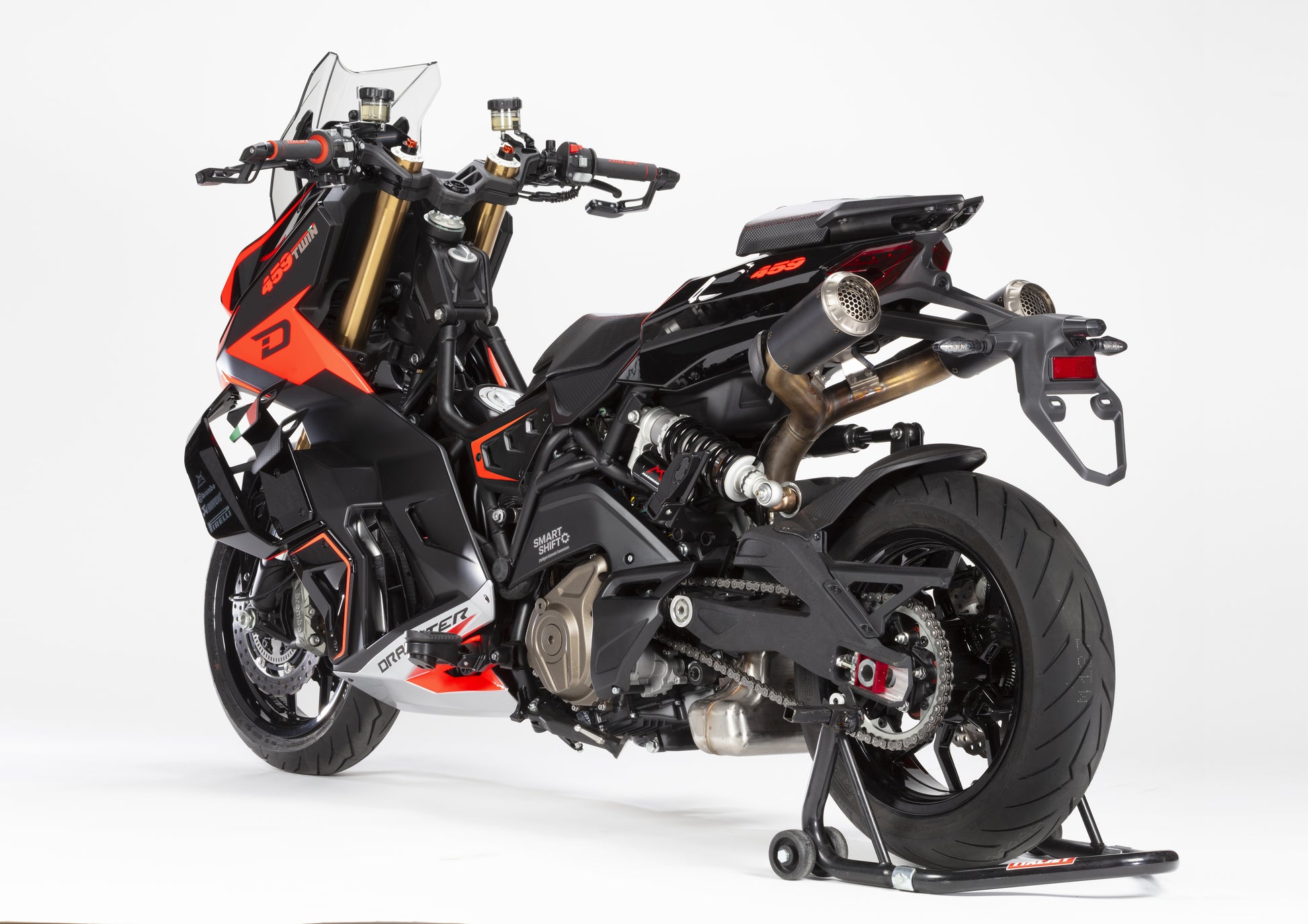 Mit seinem freiliegenden Gitterrohrrahmen, der aggressiven Optik und der unverkennbaren Dragster-DNA verkörpert der 459 Twin SmartShift puren Dragster-Spaß.