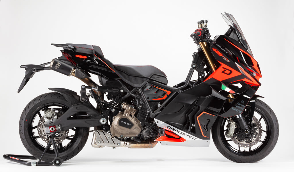 Built on the same platform as the iconic Dragster 700 Twin, the 459 introduces a new 449 cc inline twin-cylinder engine producing 35 kW (48 hp) and 41 Nm of torque, delivering explosive acceleration with Italjet’s trademark precision.