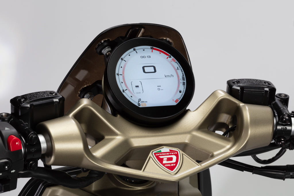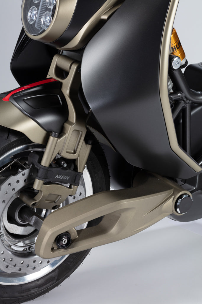 Italjet’s patented scissor-linkage steering system inspired by the Dragster, offering unmatched cornering precision and a choice between firm, sporty handling or a softer, more comfortable feel.